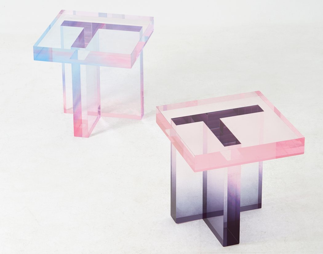 看到设计师 XXXXX的这个系列的桌子,真的会爱上玻璃,就像是真正的水晶。玻璃溶化后,在其中加上天然的颜色,按照梯度,形成颜色过渡,成型后就会在晶莹剔透中呈现美丽的色彩。每块玻璃之间通过强力胶粘合,切面处保持棱角,就会形成光线折射。不过,如此硬度的棱角是否会容易造成人体伤害,尤其是孩子。