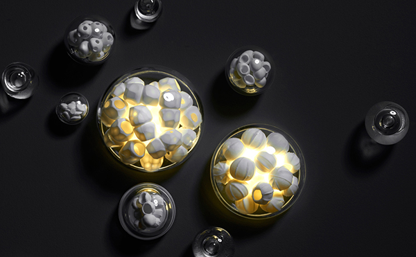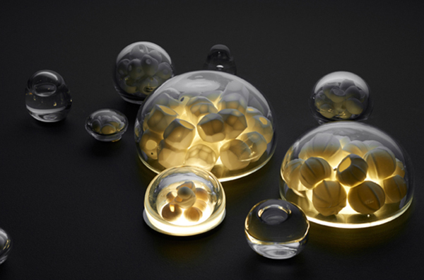 灵感来源于潜水时,尤其是海底漫步时,潜水员头上的那个玻璃罩,透过这个玻璃罩就可以看到海底的美景。这款壁灯采用了同样的形状,内部的填充物为骨质瓷制作的气泡型物体,有一定透光性,这些填充物就像是海洋的泡沫,在中间安装有 LED 灯,光线透过陶瓷就会有微妙的变化,显得柔和温暖。灯的大小可以根据实际情况定制,还可以配上相应的无 LED 款式作为墙壁装饰。