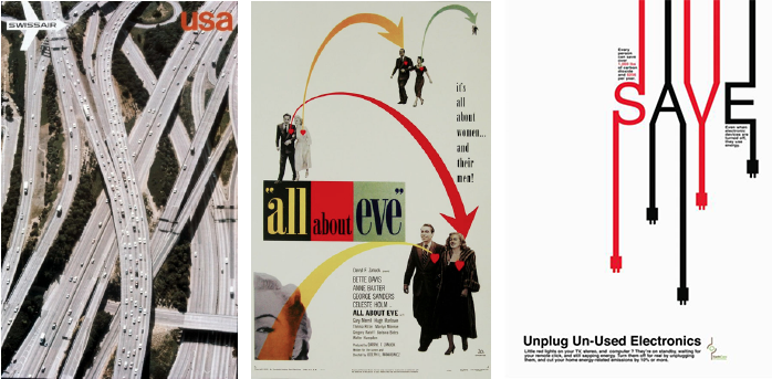 如上面所示左图是瑞士航空公司的海报设计,不同方向的蜿蜒的公路线条性感的交织在一起,使得画面非常丰富。