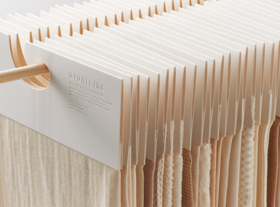 原创布料通过压花阴影体现了素材上的精细感,图表式的设计构想将其以布料衣架和标签的形态表现了出来。